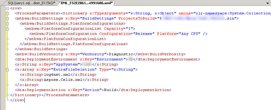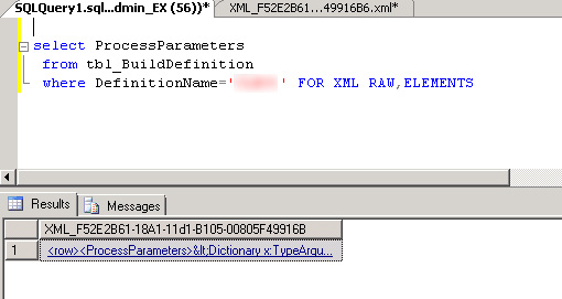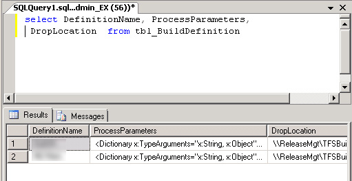Sous TFS 2005 tout était stocké au niveau de la définition des builds, dès TFS 2008 une partie a migrée en base… Et depuis TFS 2010, tout est en base de données. Pour s’en assurer, il suffit de se connecter à la base de données SQL Server de TFS pour votre Team Project Collection (attention, ne modifier pas cette base sinon c’est votre garantie qui n’est plus valide). La petite requête suivante fait apparaître la colonne ProcessParameters